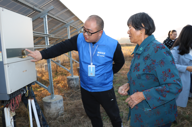 會(huì)后,博陽(yáng)黨支部一行人驅(qū)車到達(dá)平橋鄉(xiāng)新店村光伏扶貧電站所在地。工程師們現(xiàn)場(chǎng)教學(xué),為村民王務(wù)全對(duì)電站的維護(hù)工作進(jìn)行操作示范。他們耐心地指導(dǎo)村民正確查看電站運(yùn)行狀況和清潔太陽(yáng)能發(fā)電板,為運(yùn)維人員答疑解惑,確保光伏扶貧電站正常工作。