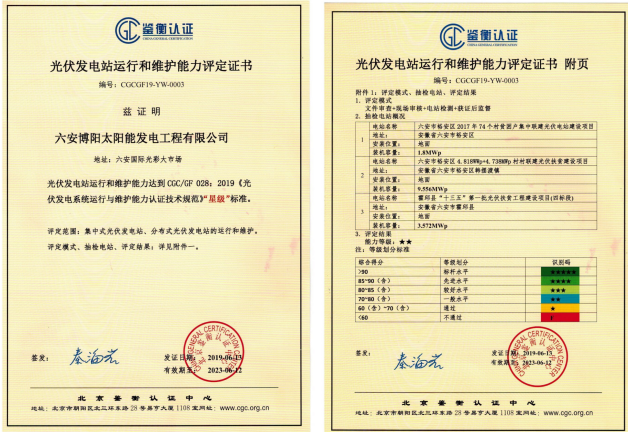 近日,經(jīng)北京鑒衡認(rèn)證中心評(píng)定,我公司光伏發(fā)電站運(yùn)行和維護(hù)能力達(dá)到CGC/GF 028:2019《光伏發(fā)電系統(tǒng)運(yùn)行與維護(hù)能力認(rèn)證技術(shù)規(guī)范》“星級(jí)”標(biāo)準(zhǔn),標(biāo)志著我公司在光伏發(fā)電系統(tǒng)運(yùn)維領(lǐng)域的新的突破。